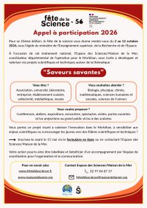 La Fête de la science 2026 dans le Morbihan prépare déjà sa 35ᵉ édition. Elle se déroulera du 2 au 12 octobre 2026 et mettra à l’honneur le thème « Saveurs savantes ».
