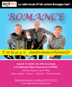VENEZ DANSER, TOURBILLONNER, DÎNER, VOUS AMUSER, SAMEDI 12 OCTOBRE AVEC L’ORCHESTRE ROMANCE à LARMOR-PLAGE !!!
