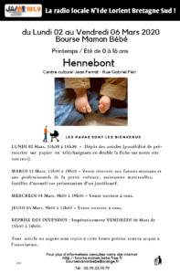La BOURSE MAMAN BEBE HENNEBONT Printemps-été se déroulera du 6 au 10 Mars prochain, au programme :....